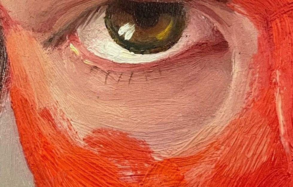 When I paint someone, choosing color isn’t aesthetic: it’s what you want to say about or to yourself. Blue says one thing; red, another. In 2024, I painted myself in red and it meant something else entirely. Color is a dialogue with your inner world. For me, red became a raised head: moving forward despite difficulty. The next color might be blue again, but with a different feeling. That’s why I keep painting masked portraits: a dialogue through color, with myself and with the world.